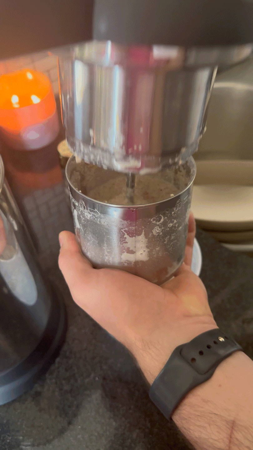 Another thing worth noting is that this milk maker automatically separates the pulp from the milk so you don’t have to manually. In line with the brand’s commitment to sustainability and waste reduction, the company encourages users to repurpose the leftover pulp for various vegan-friendly recipes. They even have a dedicated section of nut pulp recipes on its website where you can find creative ideas like cashew pulp alfredo pasta and almond butter cookies, among many other delicious options. Here’s what the filter basket full of pulp looked like after making almond milk: